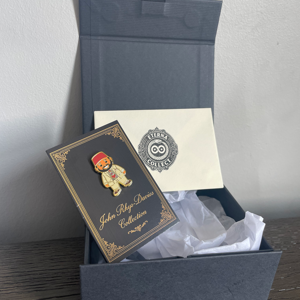 This finely crafted 3cm enamel pin captures character and artistry in equal measure. Finished with meticulous attention to detail, it is mounted on an elegantly designed backing board, created exclusively by Eterna Collect. Each pin is presented in a protective envelope for safe keeping and easy gifting, ensuring it arrives ready to be treasured or proudly displayed. A compact yet distinguished collectible worthy of any John Rhys-Davies fan’s collection.